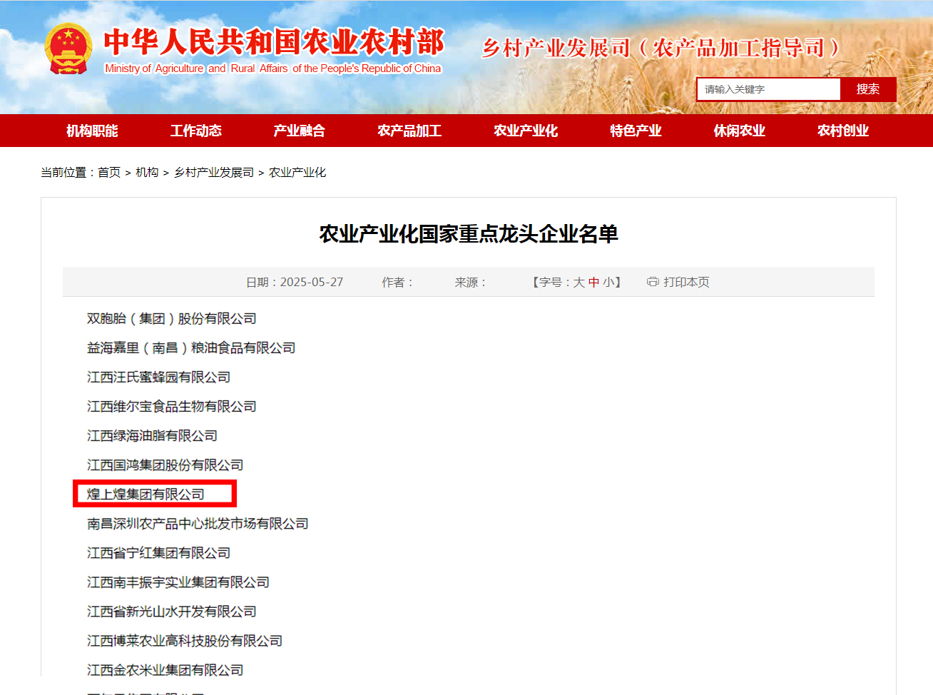 近日,農(nóng)業(yè)農(nóng)村部公布農(nóng)業(yè)產(chǎn)業(yè)化國家重點(diǎn)龍頭企業(yè)最新名單。其中,煌上煌集團(tuán)有限公司再次獲評(píng)“農(nóng)業(yè)產(chǎn)業(yè)化國家重點(diǎn)龍頭企業(yè)”,這是煌上煌...